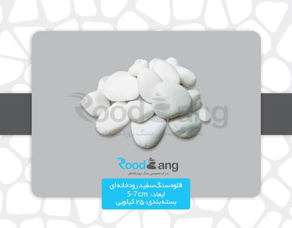 سنگ رودخانه ای سفید سایز 5 تا 7 سانت، سنگهای رودخانه ای هستند که به صورت طبیعی در کنار رودخانه های کم عمق یافت می شود که این سنگها در اثر برخورد با آب رودخانه و طی گذشت زمان به صورت گرد گوشه در آمده که می توان از آنها در صنعت ساختمان به ویژه دکوراسیون استفاده نمود.